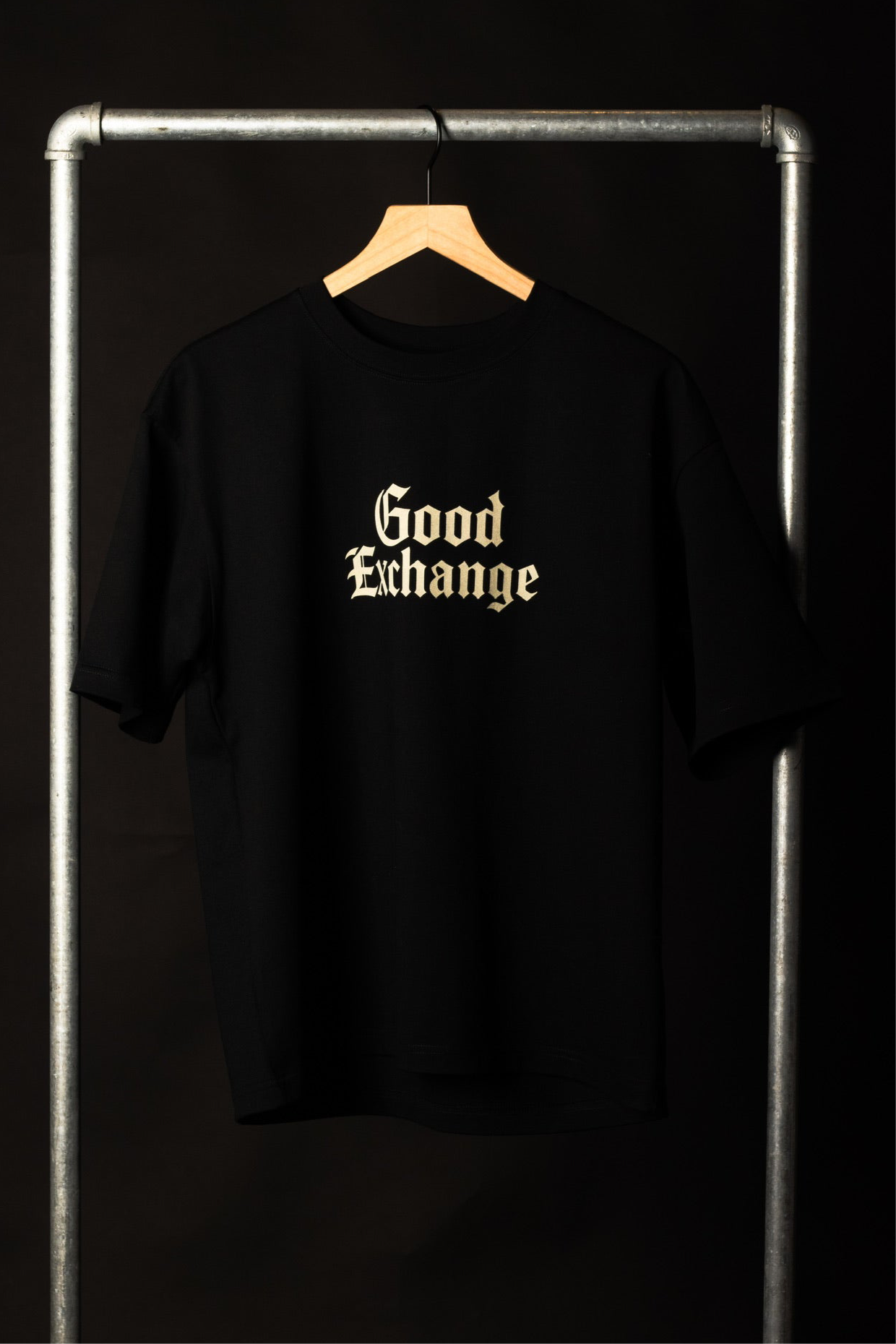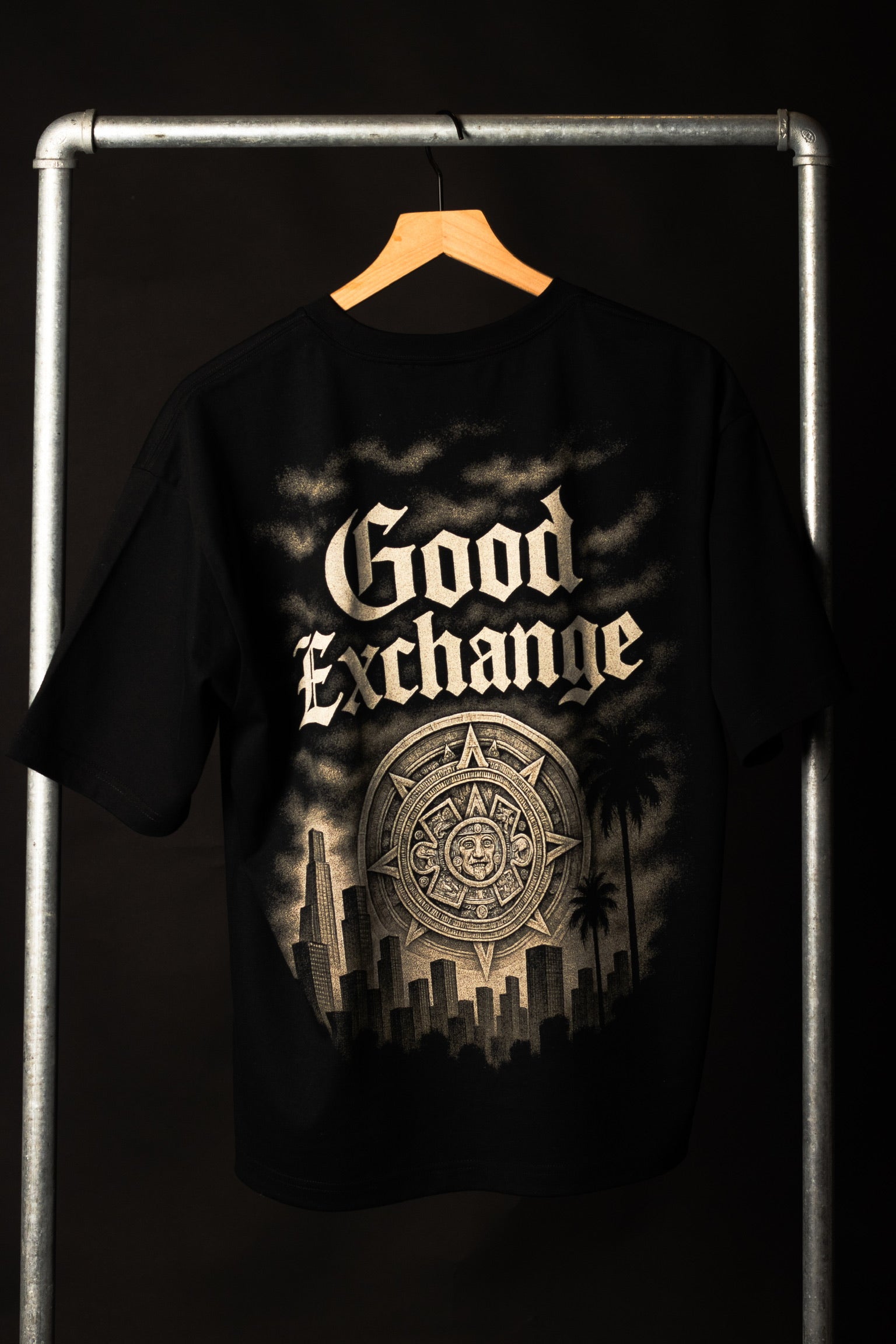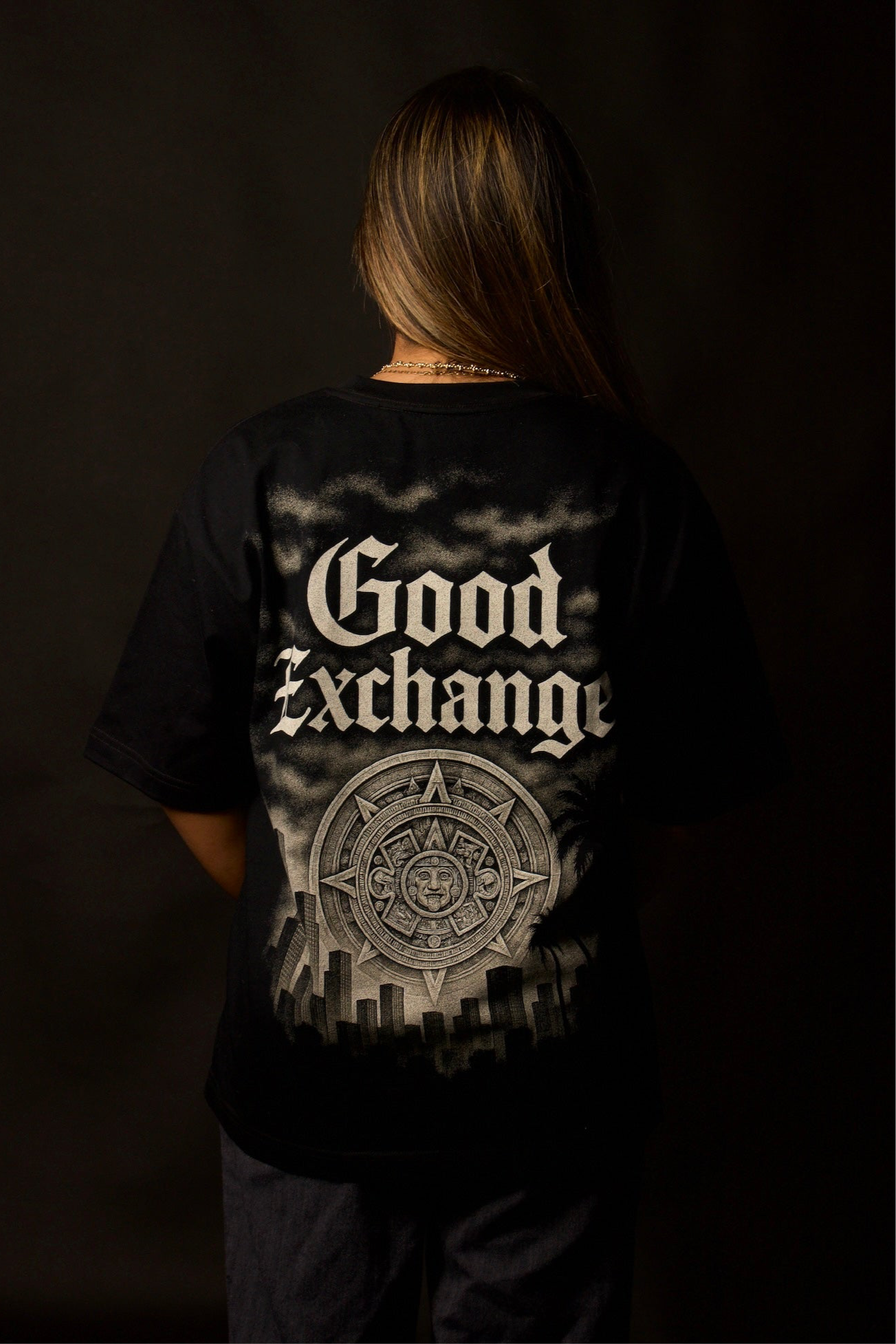 The back showcases a DTG-printed Aztec calendar, layered with clouded shadows and a soft skyline fade for depth and detail. Up front, a minimal Good Exchange logo keeps it clean.
